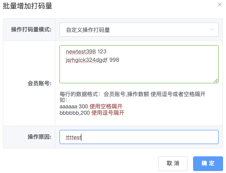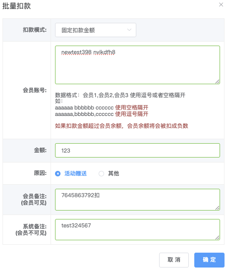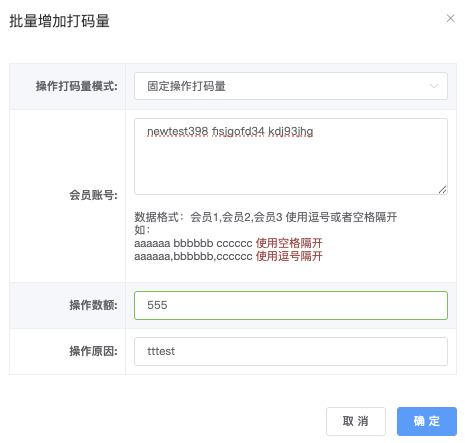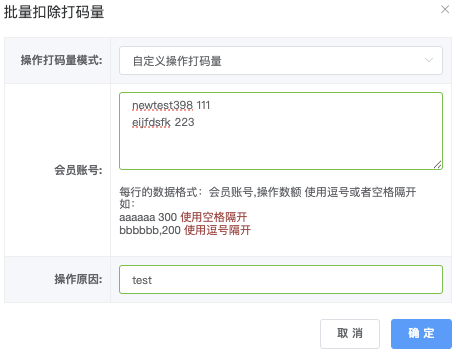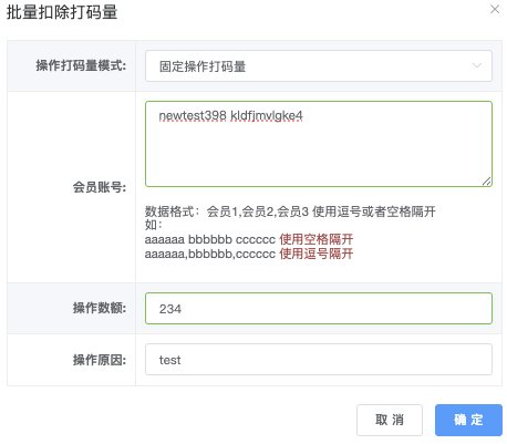 - 会员帐号:每一行帐号和操作数额 (逗号或者空格隔),支持多行