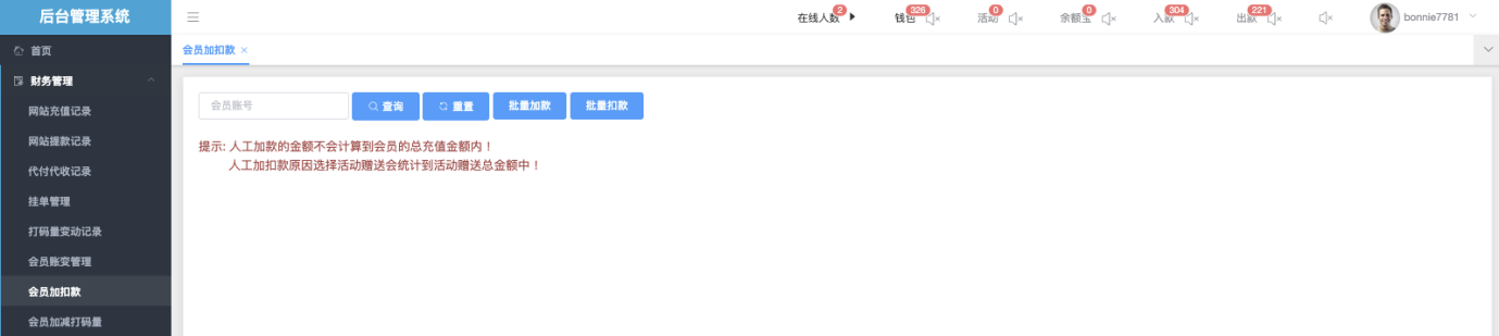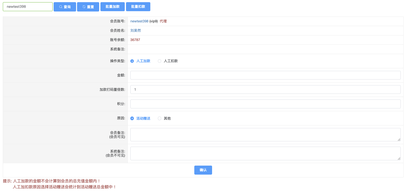 *可在该页面直接查询会员姓名、账号余额、系统备注,并进行人工加款/人工扣款操作。