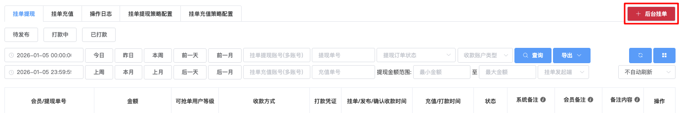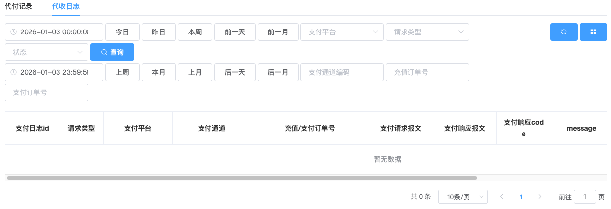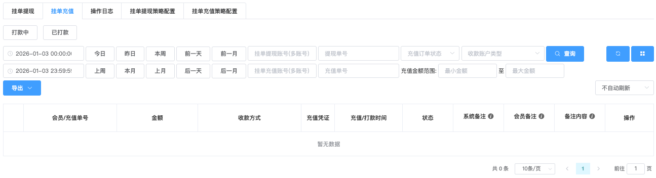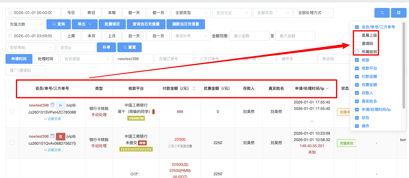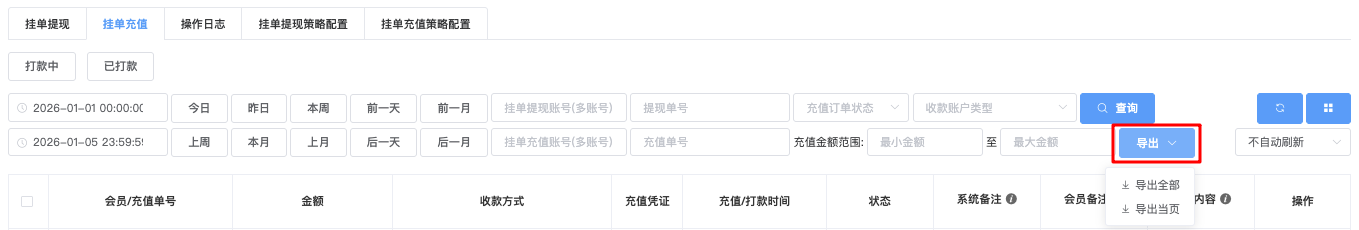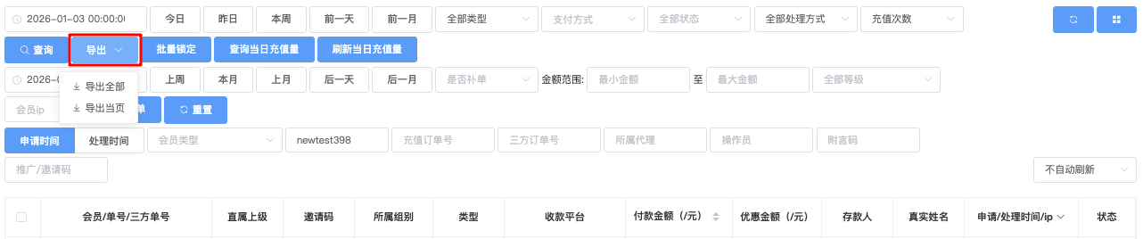 - 支持多选:支付方式、支付渠道、状态(例如未处理、处理中、充值成功、充值失败、已过期)