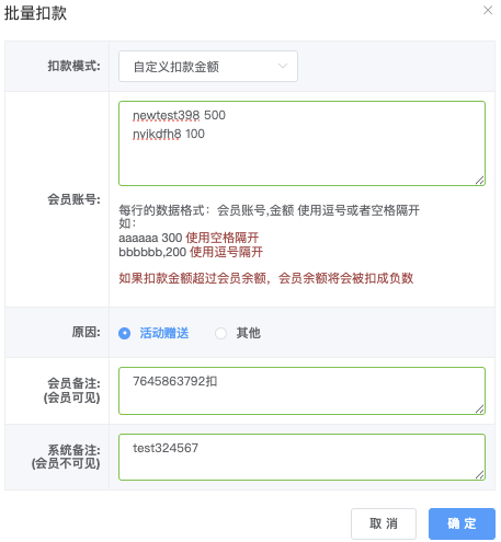 - 操作类型(人工加款 / 人工扣款)扣款金额超余额时,会员余额将变为负数