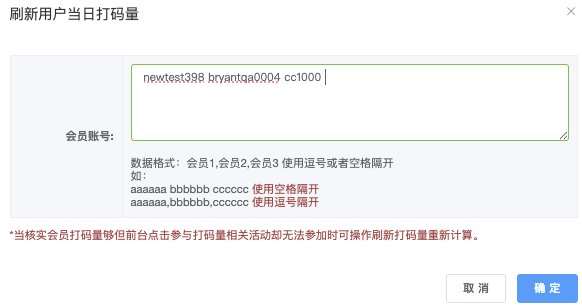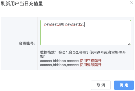 - 输入要刷新的会员帐号,支持多个帐号(逗号或者空格隔)
