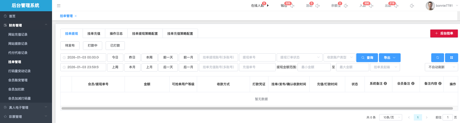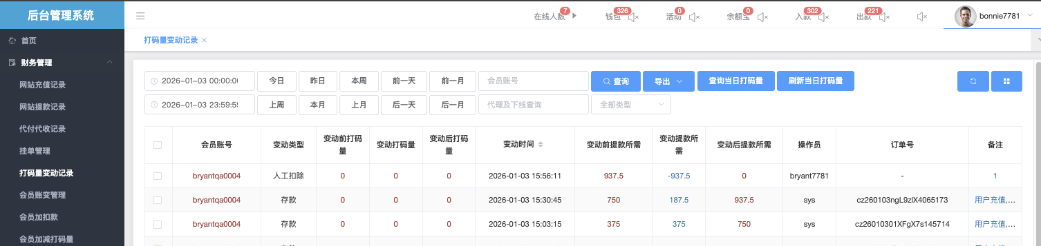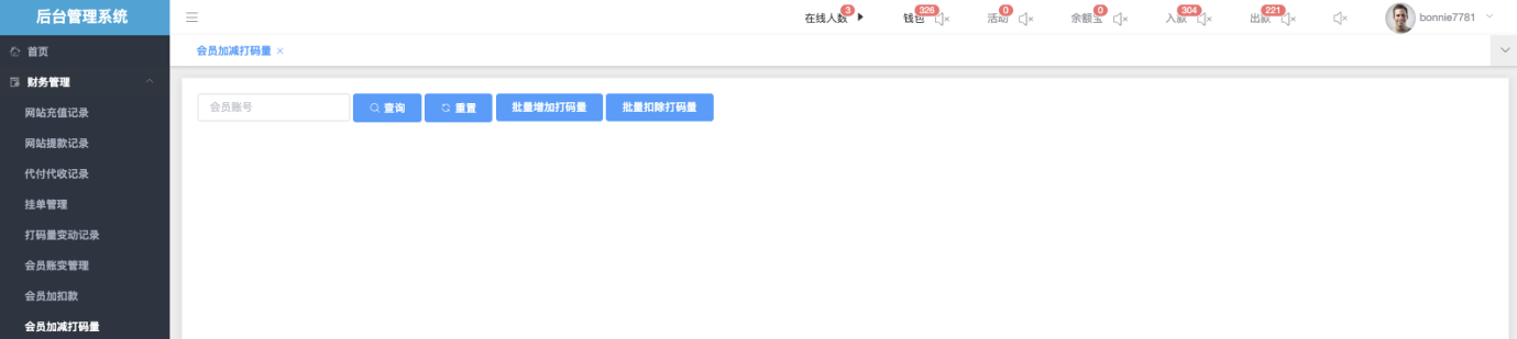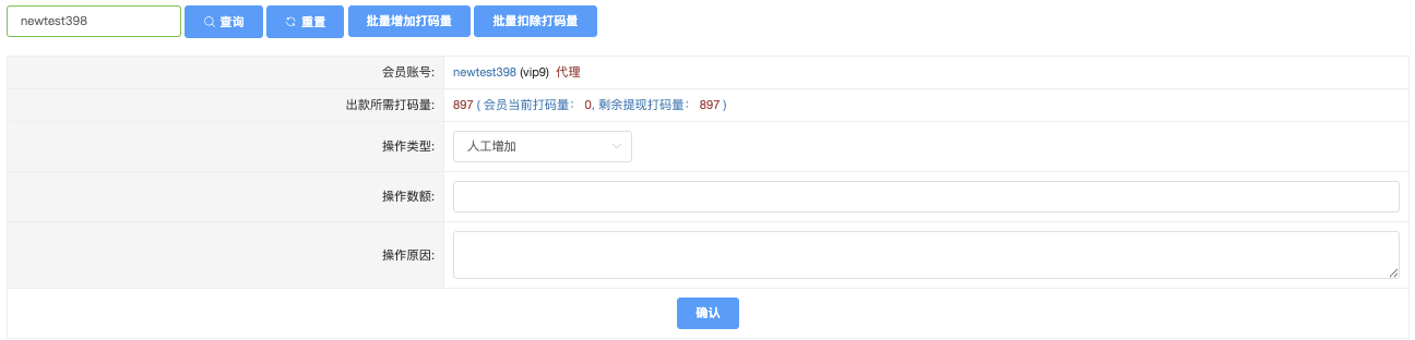 *可在该页面直接查询 会员出款所需打码量,并进行人工增加/人工扣除、操作数额。