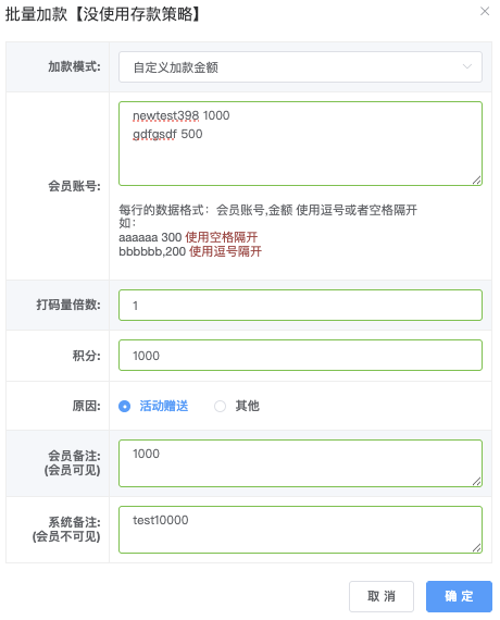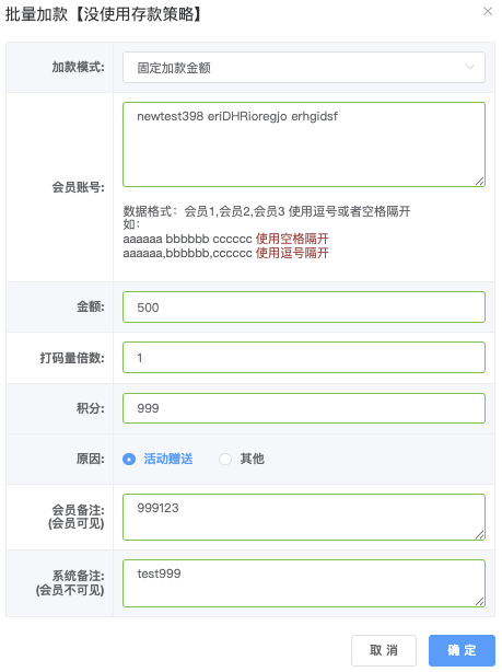 - 会员帐号:每一行帐号和金额 (逗号或者空格隔),支持多行