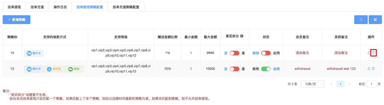 - 在需要删除的配置策略右侧操作栏,点击「