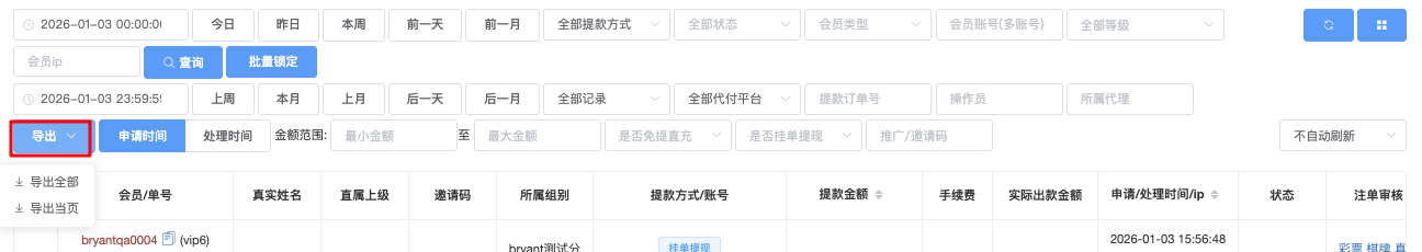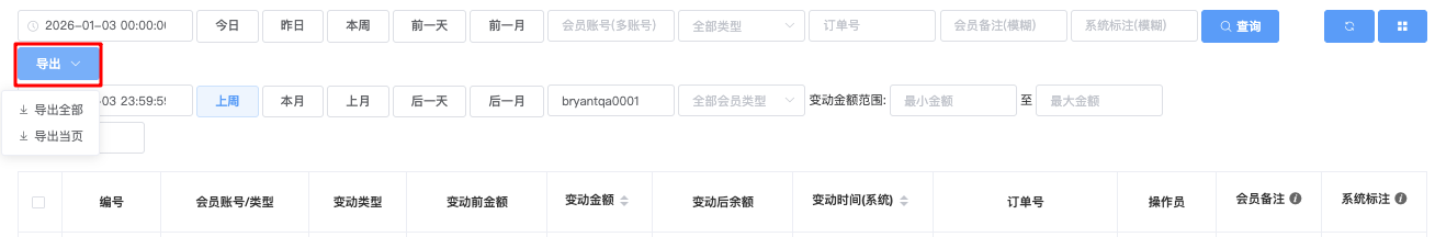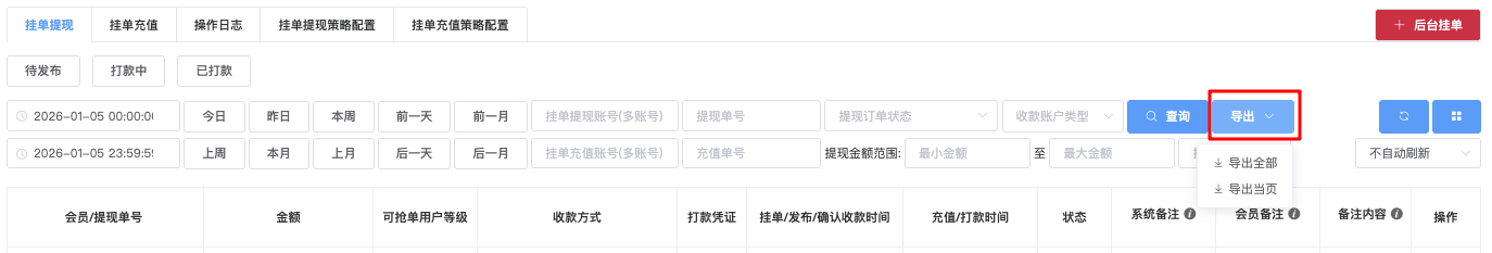 - 导出全部 → 导出符合当前筛选条件的全部数据