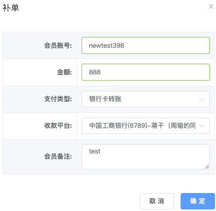 用途:手动为会员创建/补录充值记录