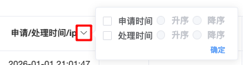 」,可針對該欄位 申请时间 / 处理时间 單獨選擇「升序」或「降序」排序,方便資料查詢。