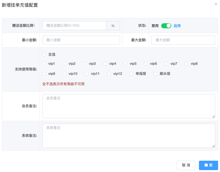 - 单选:处理方式(系统处理、手动处理)、充值次数(首充、二充、三充)