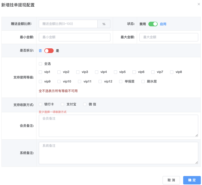 - 特殊限制:对于「代客充值」、「免提直充」、「挂单充值」类型,不能选择支付方式。
