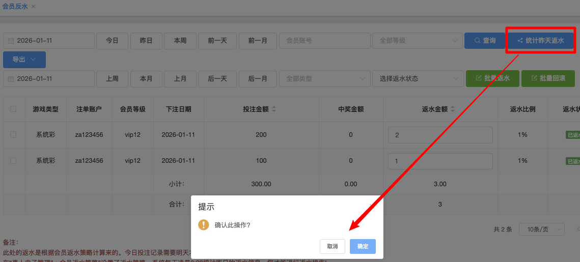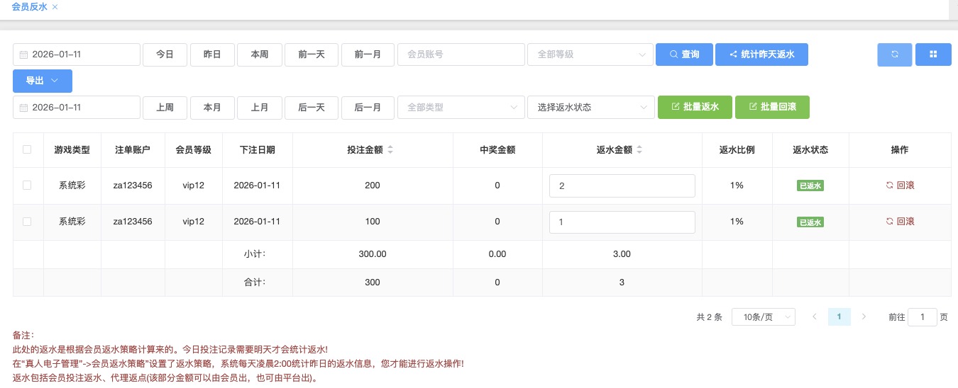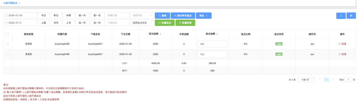 - 统计昨天返水(若系统已于凌晨自动完成昨日返点统计,则该按钮将变为无效状态)