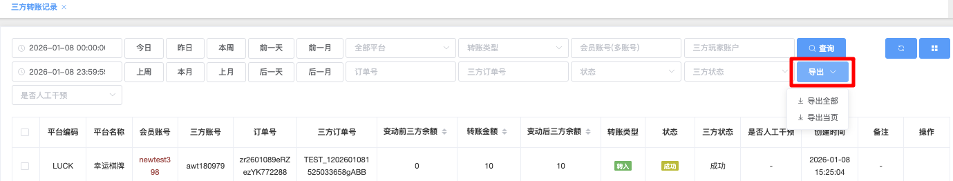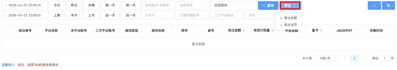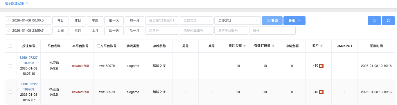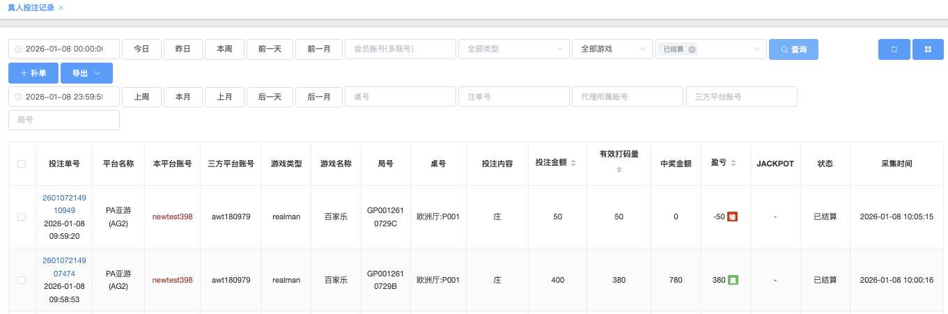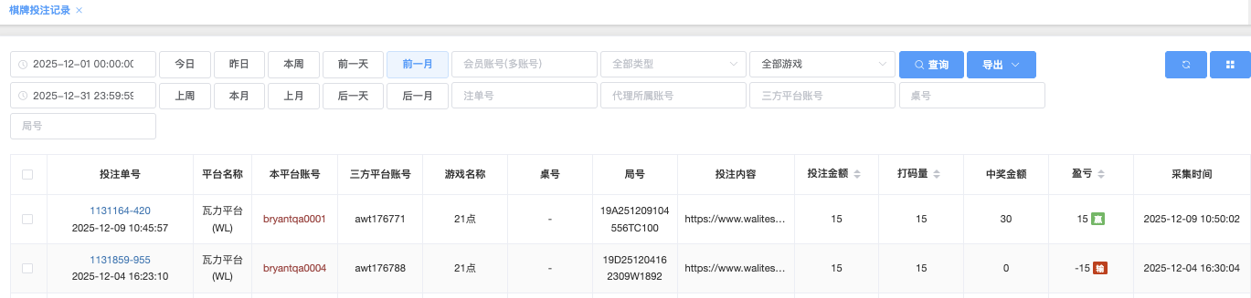 - 查询字段(可组合使用):会员帐号(支持多帐号,用逗号分隔或空格分隔)、注单号、代理所属帐号、三方平台帐号、局号,用于精确查询。
