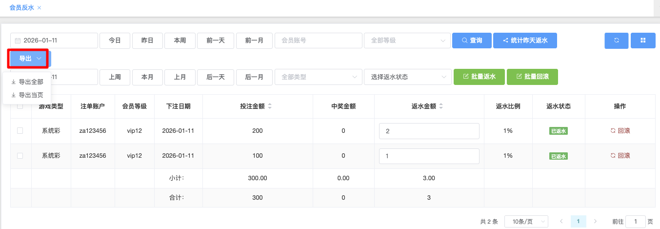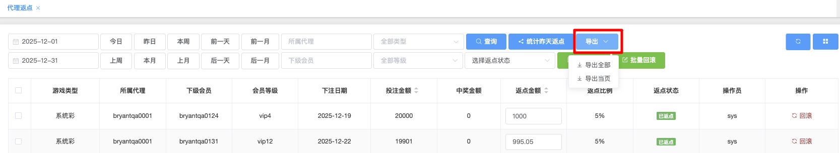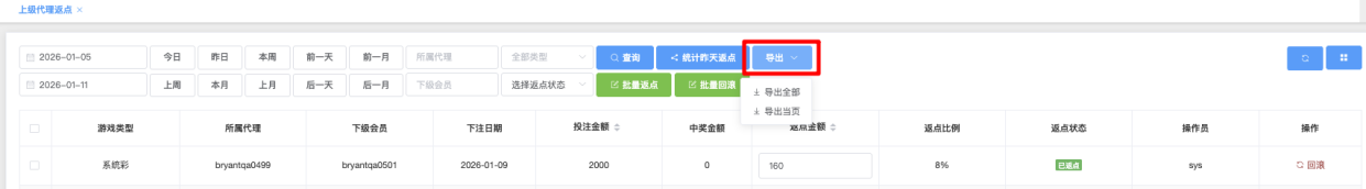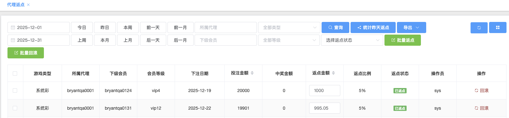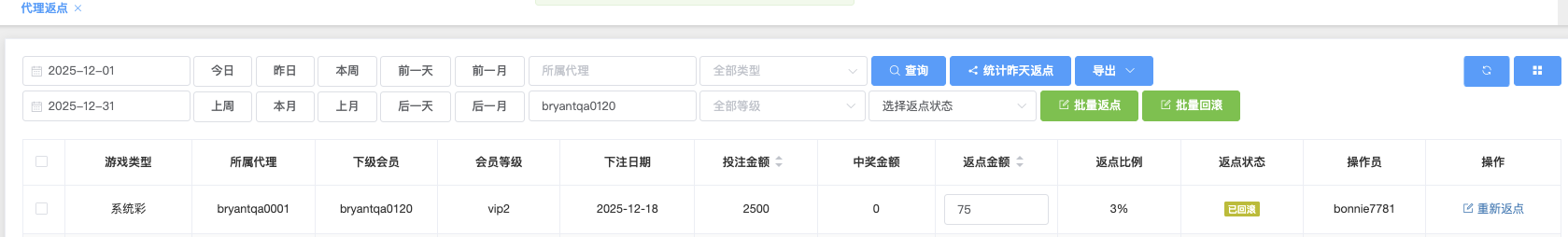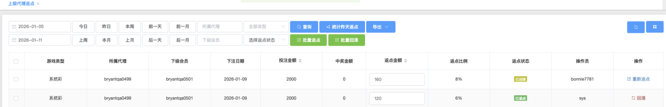 - 选择返水状态:(单选)未返点、已返点、已回滚