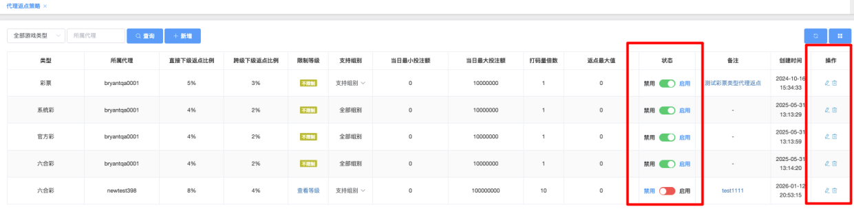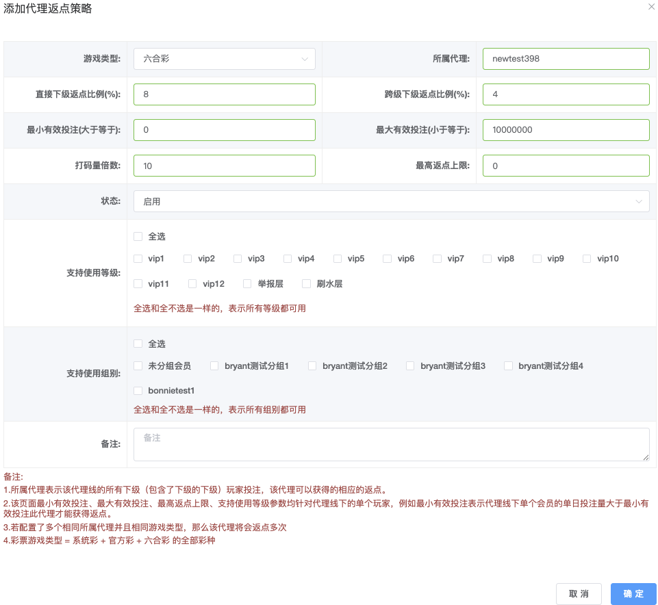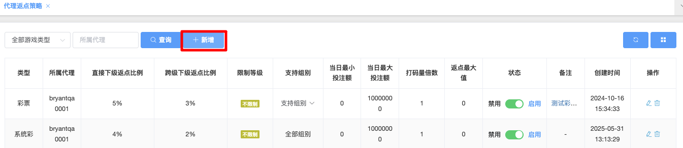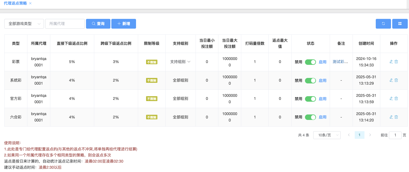- 全部游戏类型 筛选:(单选)系统彩、彩票、官方彩、六合彩。 作用:筛选特定游戏类型的代理返点策略。