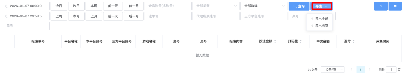 - 查询字段(可组合使用):会员帐号(支持多帐号,用逗号分隔或空格分隔)、注单号、代理所属帐号、三方平台帐号、桌号、房号,用于精确查询。