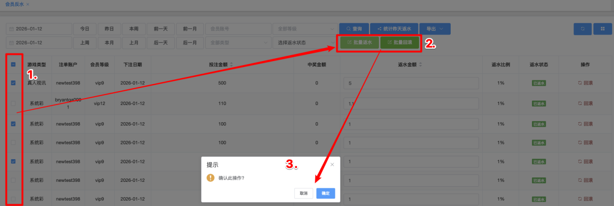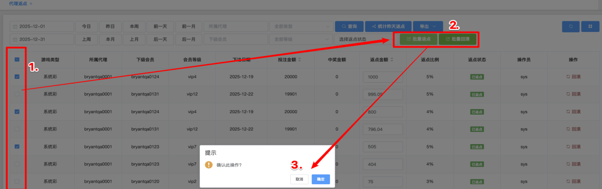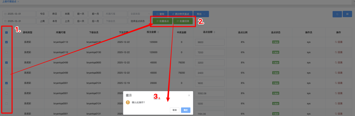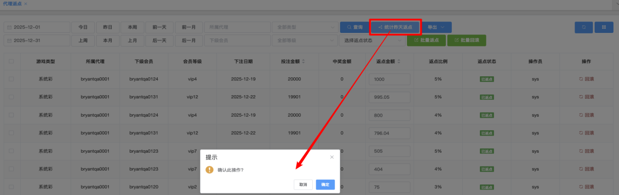 若仅需处理单个会员的返点,在表格对应行右侧的“操作”栏,点击「」回滚按钮。系统将弹出确认窗口,点击【确认】后即完成回滚,状态变为“已回滚”。
