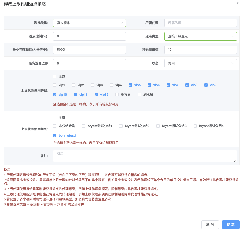 - 全部游戏(单选)选项包含:龙虎、百家乐、牛牛、轮盘、炸金花、21点 等,未设置时默认:全部游戏。