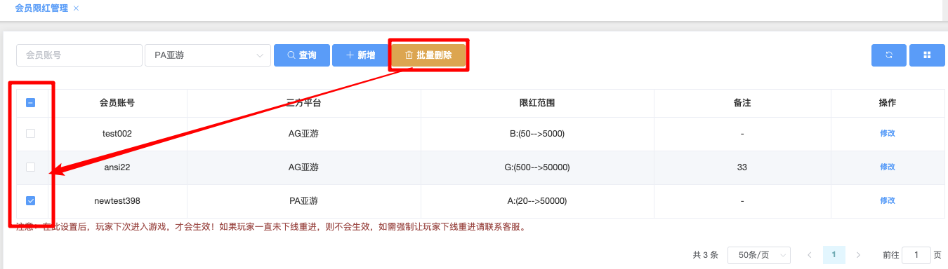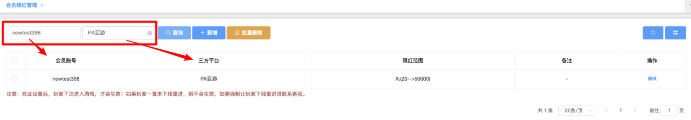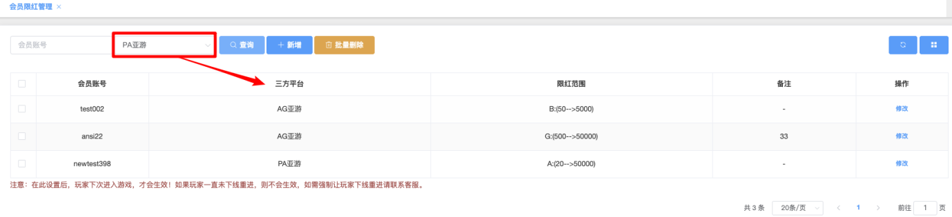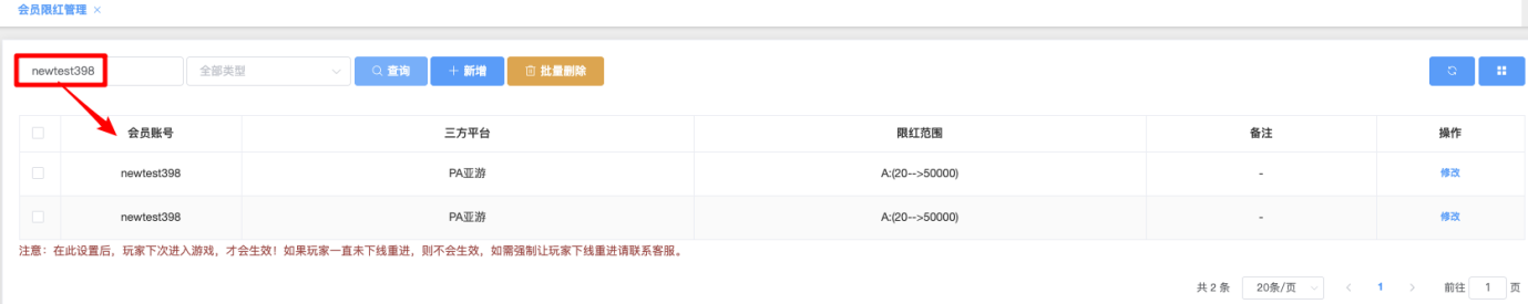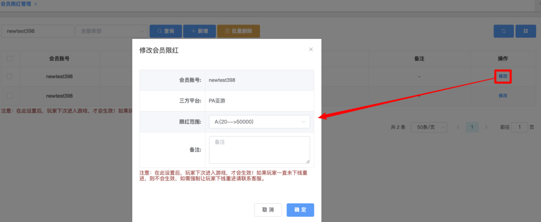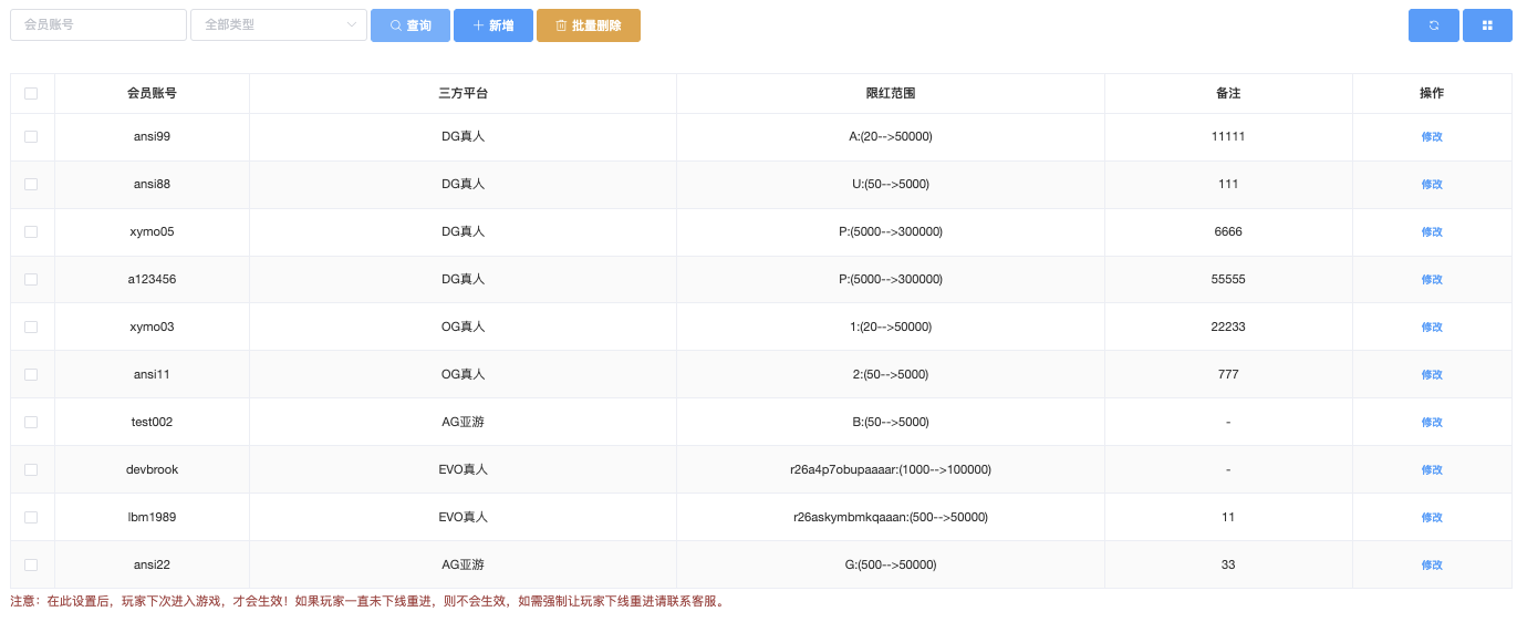 如需修改某会员的限红条件,于列表中找到对应记录,点击右侧“操作”栏的【修改】按钮。