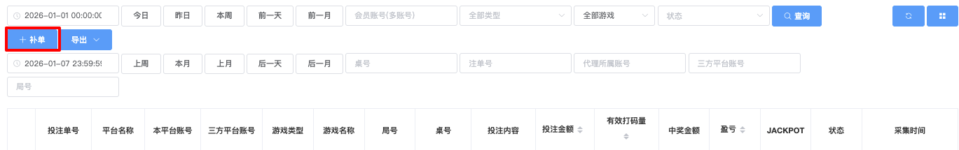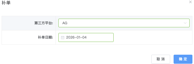 点击「补单」按钮,弹出补单窗口,需完整填写以下必填项:第三方平台、补单日期。
