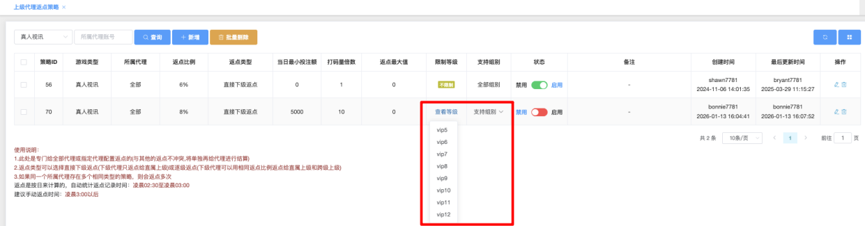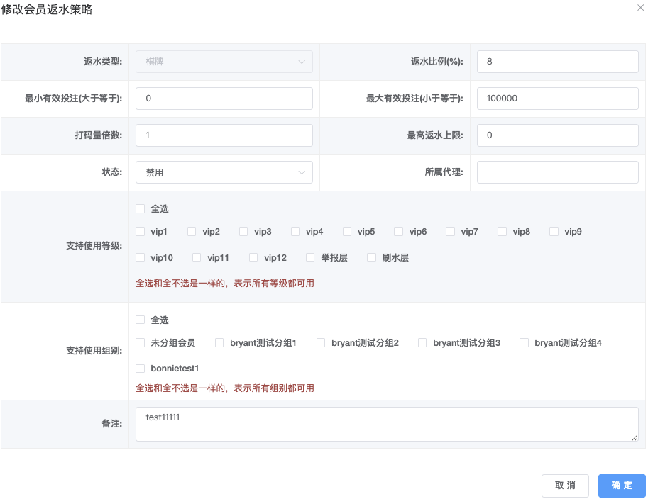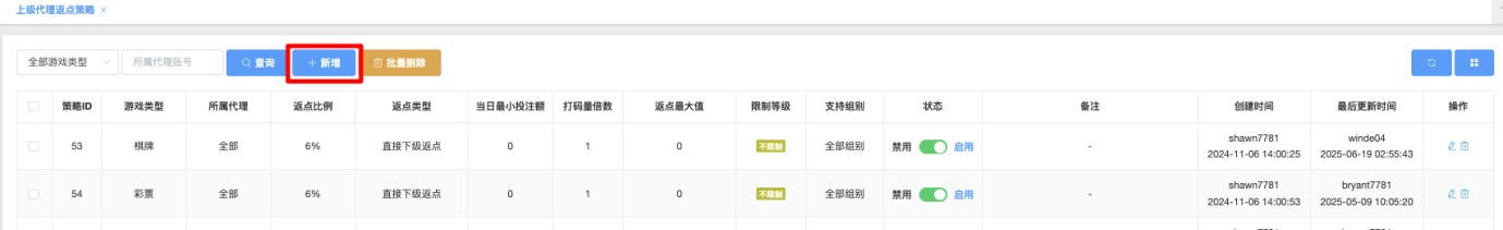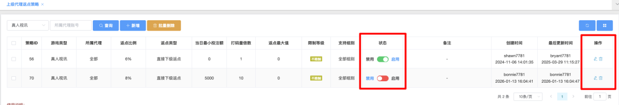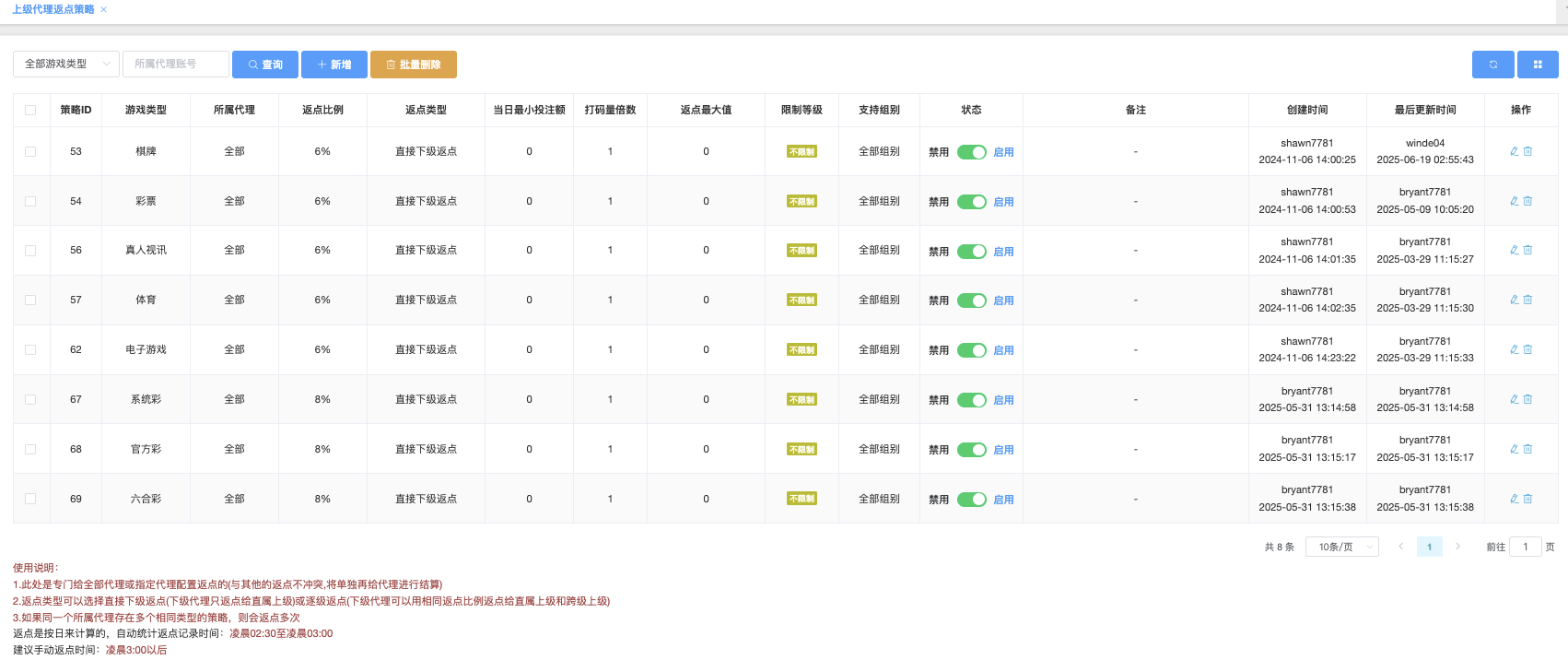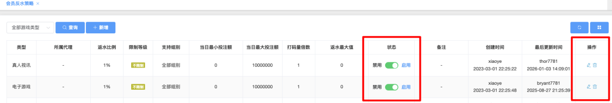 *如需修改或删除反水策略,请在列表最右侧「操作」栏中进行。