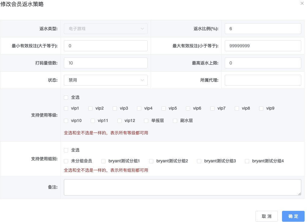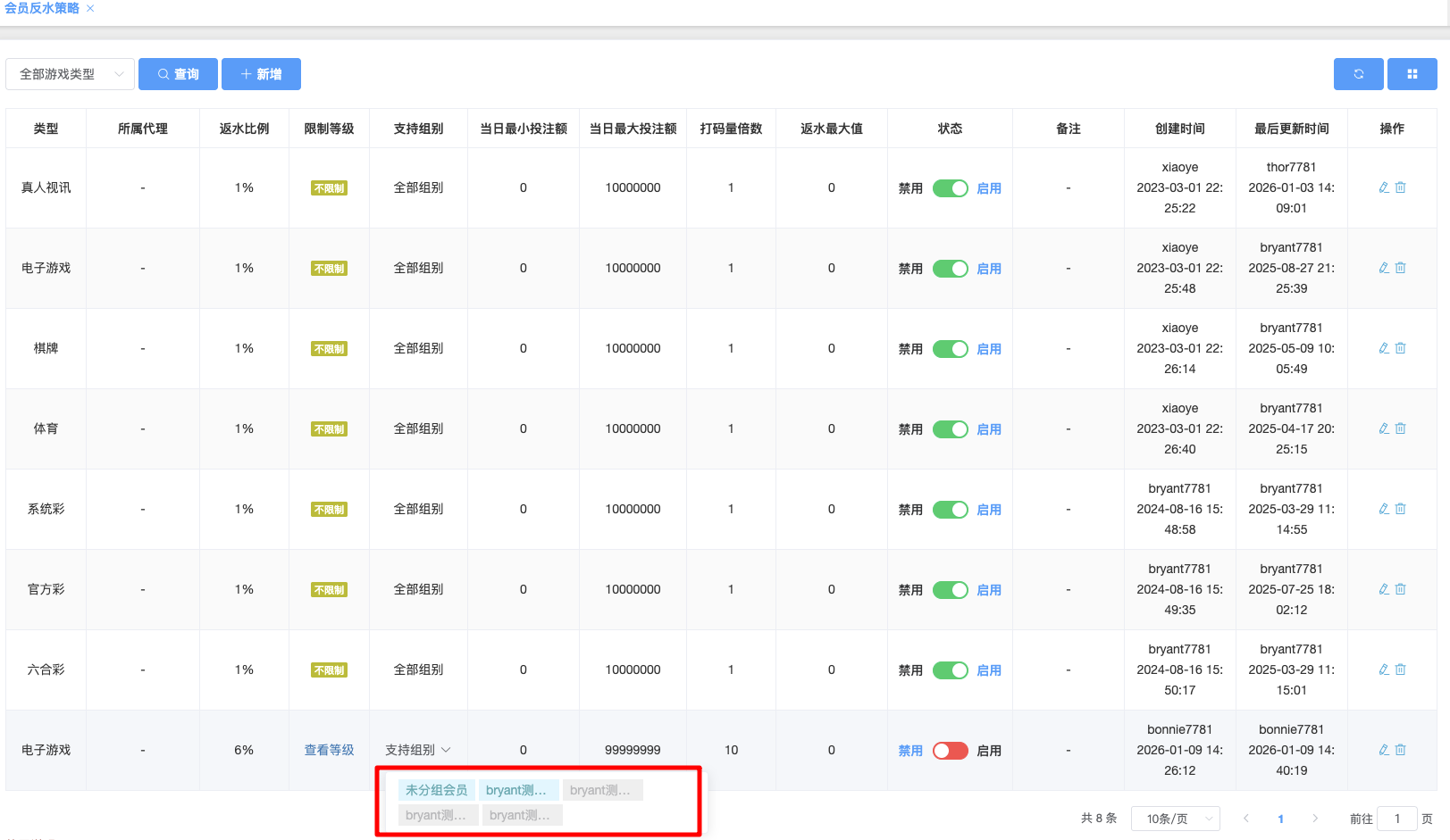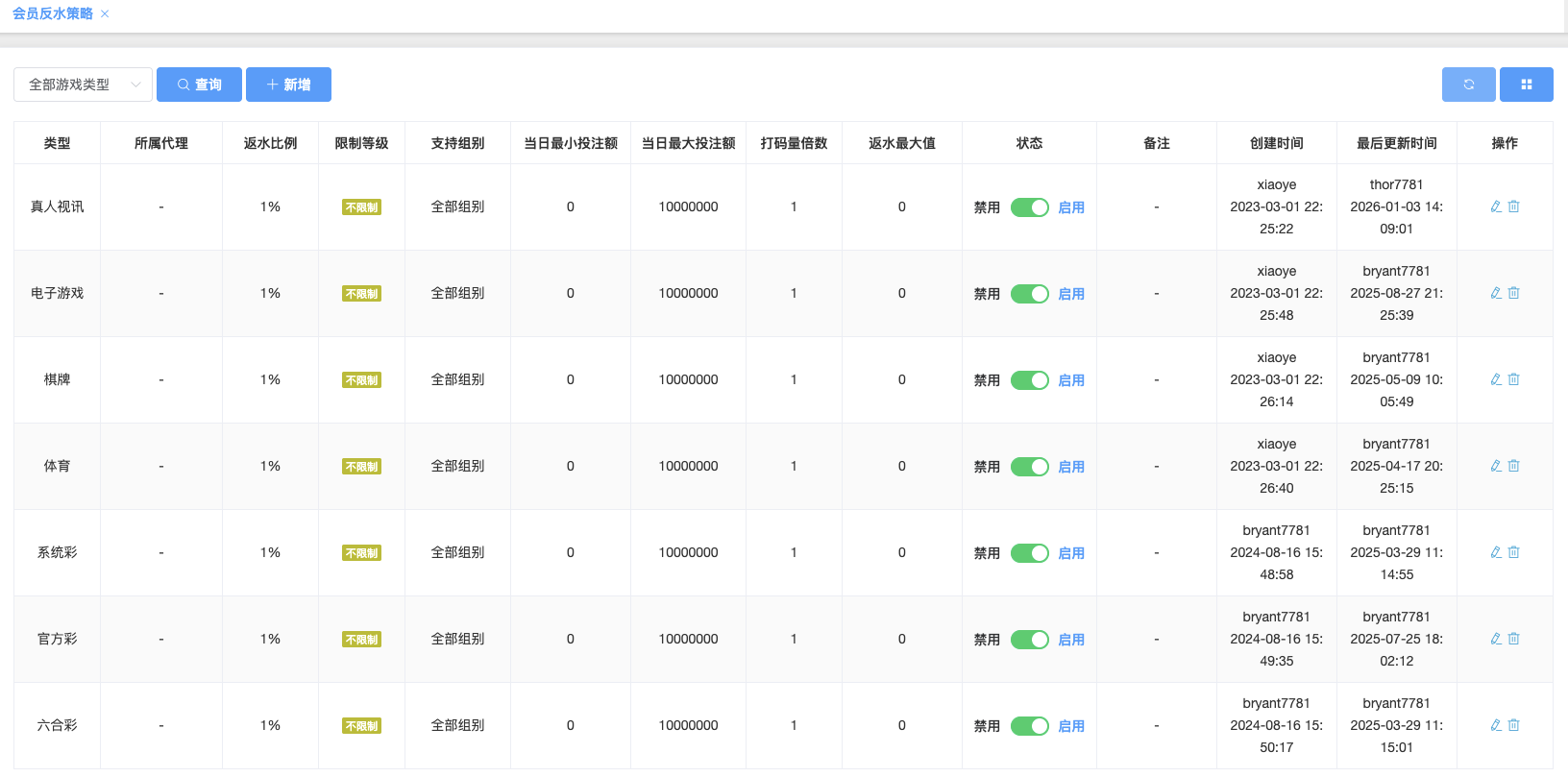 管理员可针对不同游戏类型(或全部类型)制定独立的返水策略,并快速启用 / 禁用。