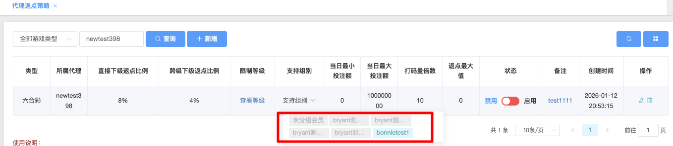 - 所属代理: 输入代理账号,快速查找某个代理的所有返点配置。