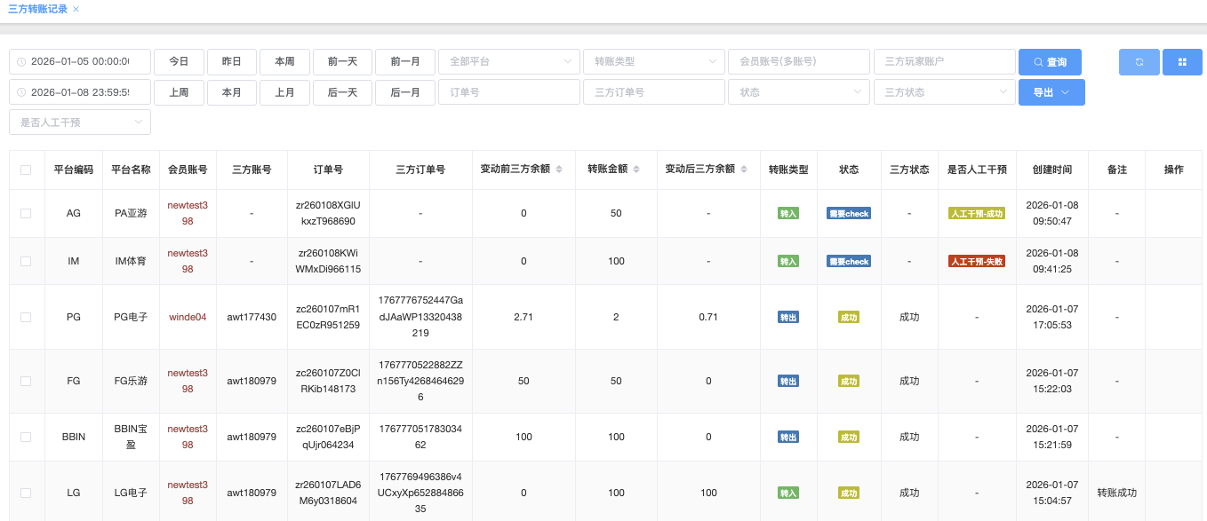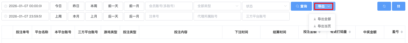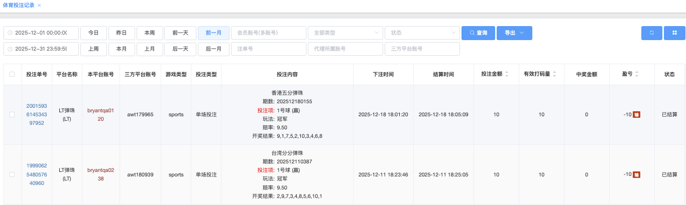 - 查询字段(可组合使用):会员帐号(支持多帐号,用逗号分隔或空格分隔)、注单号、代理所属帐号、三方平台帐号,用于精确查询。