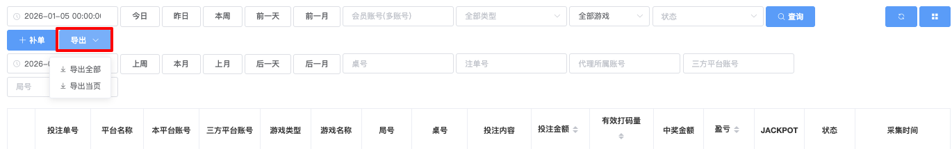 - 查询字段(可组合使用):会员帐号(支持多帐号,用逗号分隔或空格分隔)、桌号、注单号、代理所属帐号、三方平台帐号、局号,用于精确查询。