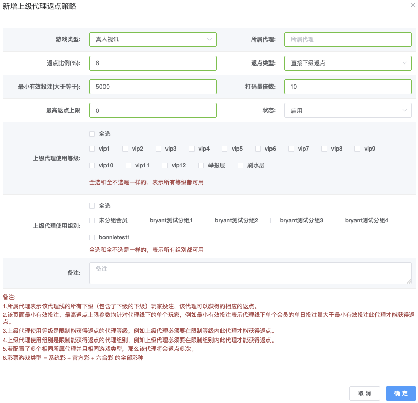 - 所属代理帐号: 输入代理账号,快速查找某个所属代理的所有返点配置。