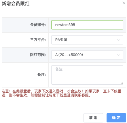 」按钮挑出弹窗,会员帐号、三方平台、限红范围 为必填,备注(选填)输入