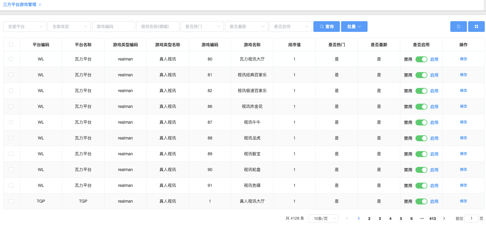 - 全部类型:(支持多选)电子游戏、棋牌、体育、真人视讯、系统彩、彩票、官方彩、六合彩