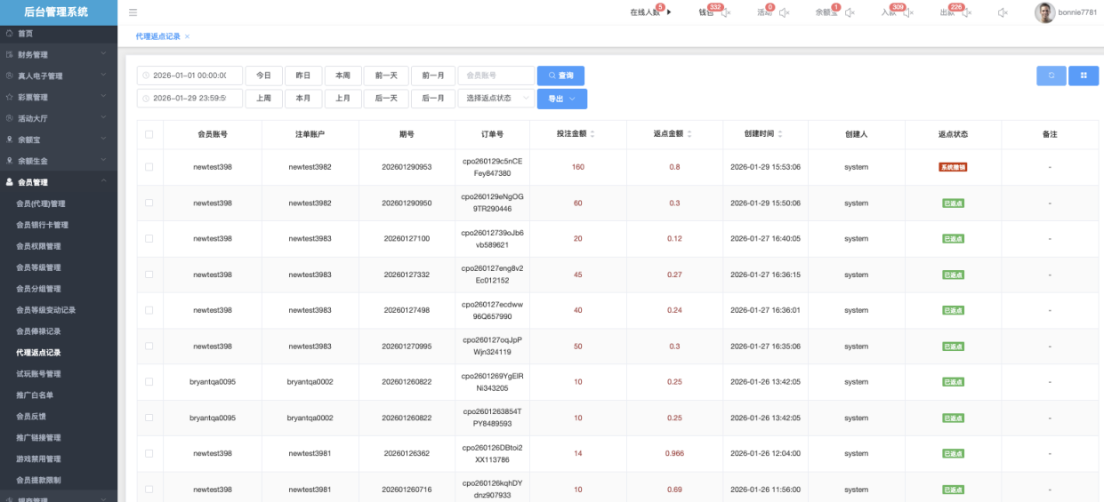 用于查询和查看代理从其下线会员投注中获得的返点明细,记录每笔投注产生的返点金额、状态、订单信息等。