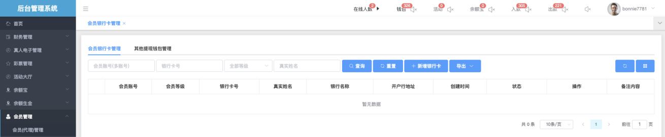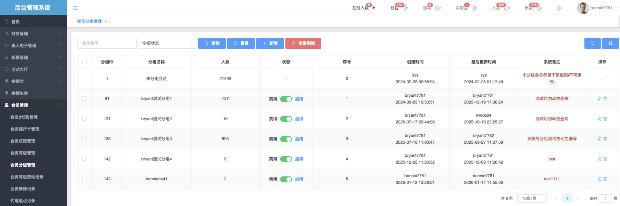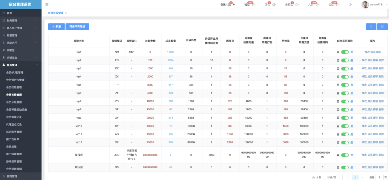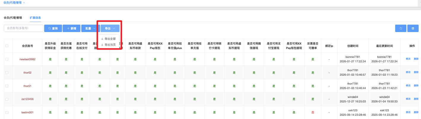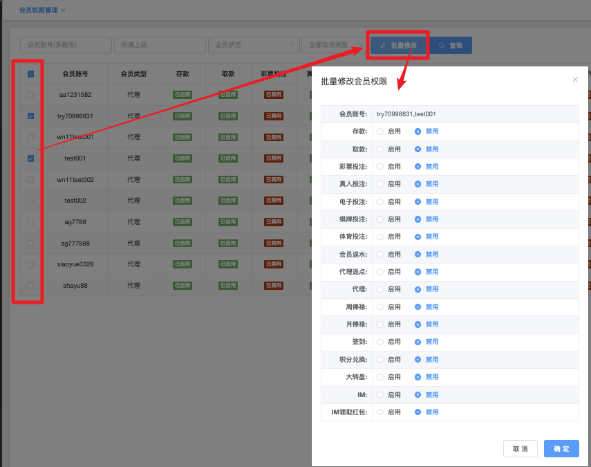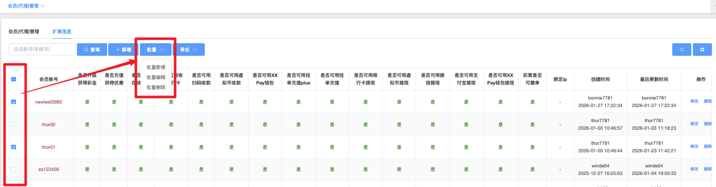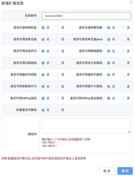 主要功能是批量或单个控制会员是否能使用各种充值、提现、优惠、支付方式等扩展功能,便于风控、活动分层、代理管理等操作。