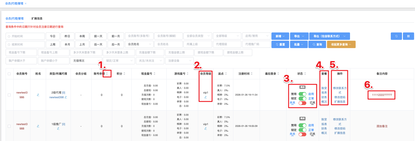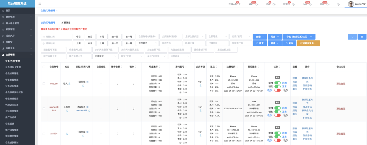 - 账号余额、积分、现金盈亏、游戏盘号、返点、注册时间、最后登录、状态