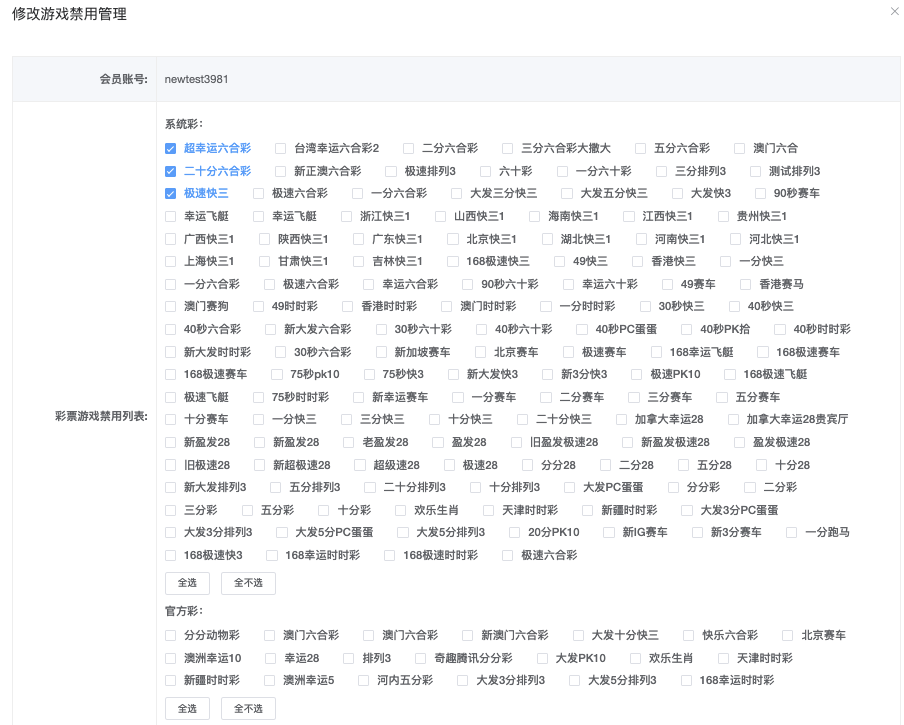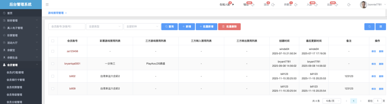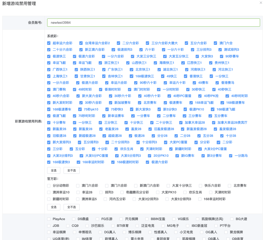 单个新增一个会员的游戏禁用设置。