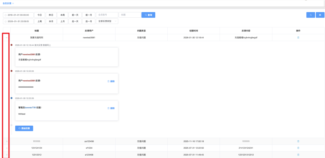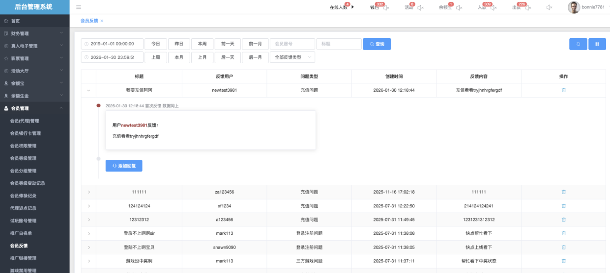 用于集中查看、处理和管理会员通过前台提交的意见、问题、投诉、求助等反馈信息,管理员可快速分类、回复、标记处理状态或删除无效反馈。