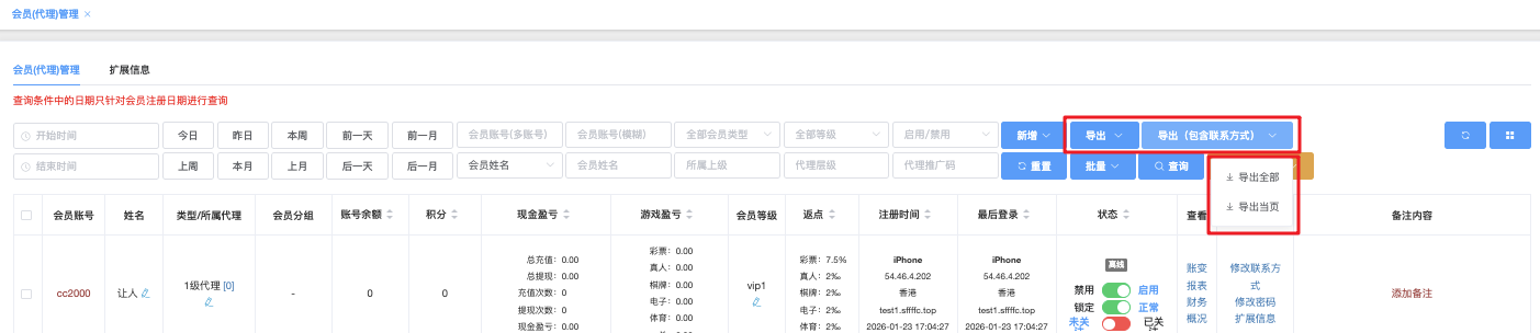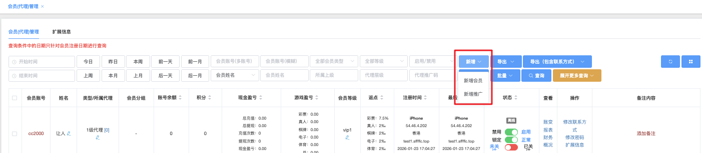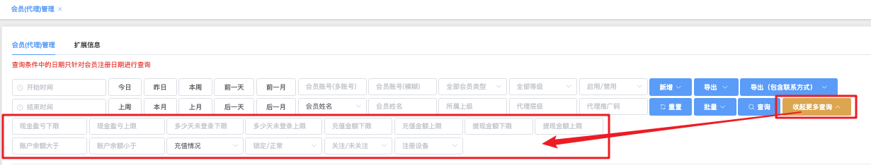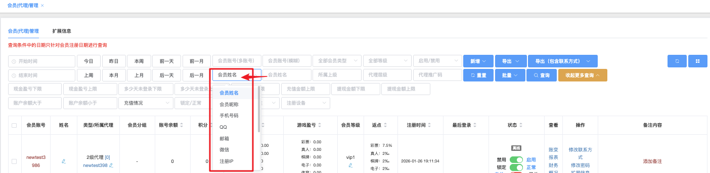 - 全部会员类型:下拉选择(会员 / 代理 / 推广)