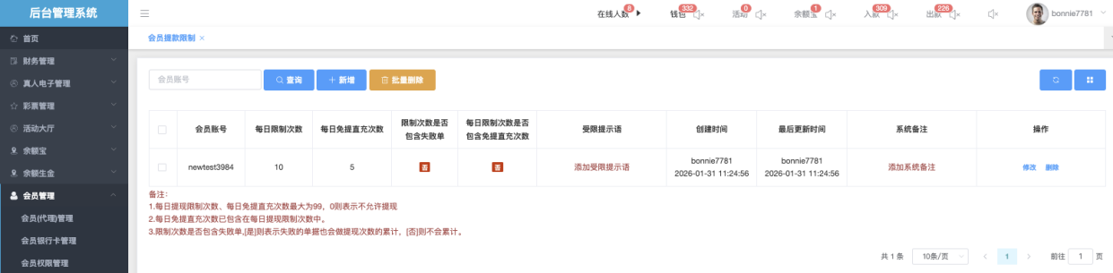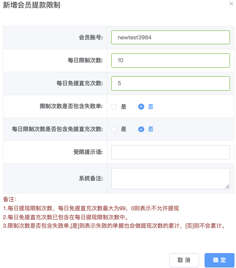 」后弹出「新增会员提款限制」,填写资讯