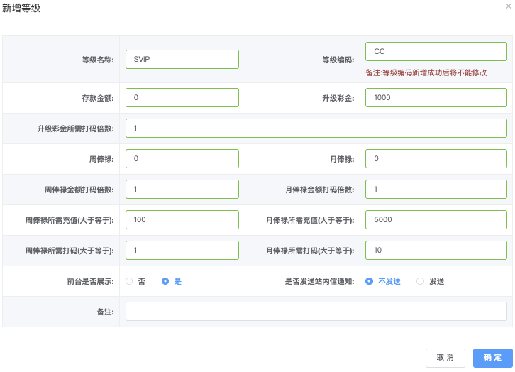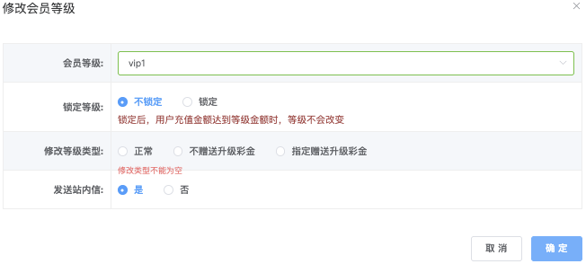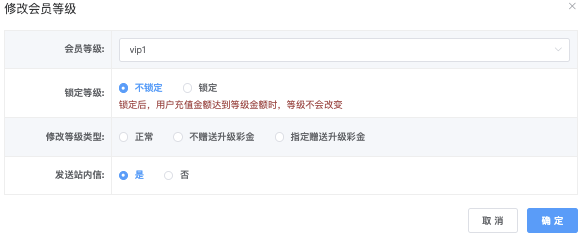 - 修改等级类型:正常、不赠送升级彩金、指定赠送升级彩金(需填写发送站内信、指定赠送升级彩金「金额」、指定赠送打码量倍数)