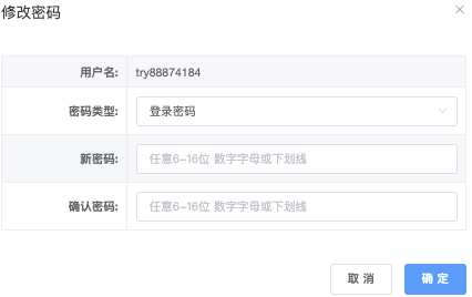 - 「修改密码」点击后,跳出弹窗填写完成,点击「确定」执行 / 「取消」放弃操作