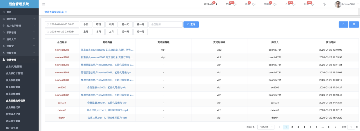 - 「帐变」点击后,跳转至「会员帐变管理」,快速查看該會員的返點收入明細、核對每筆返點來源、資金變動是否正常 相关信息。