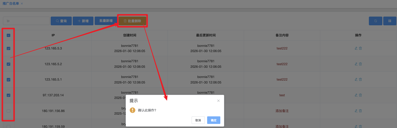 - 点击「批量删除」按钮,系统弹出确认窗口,显示:确认此操作?