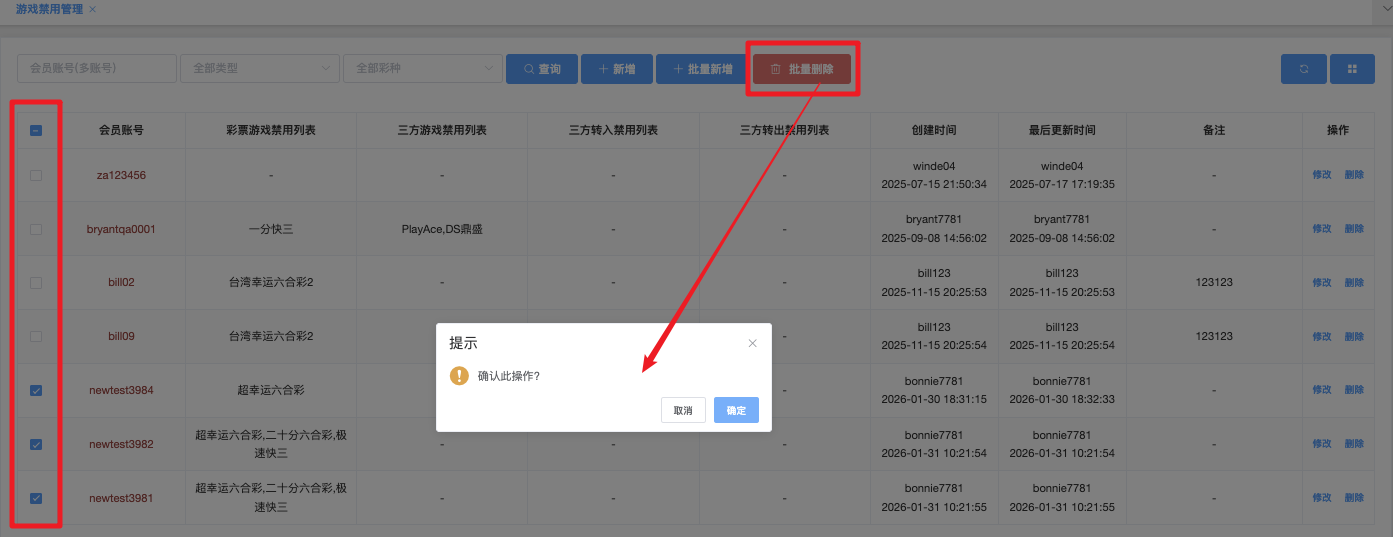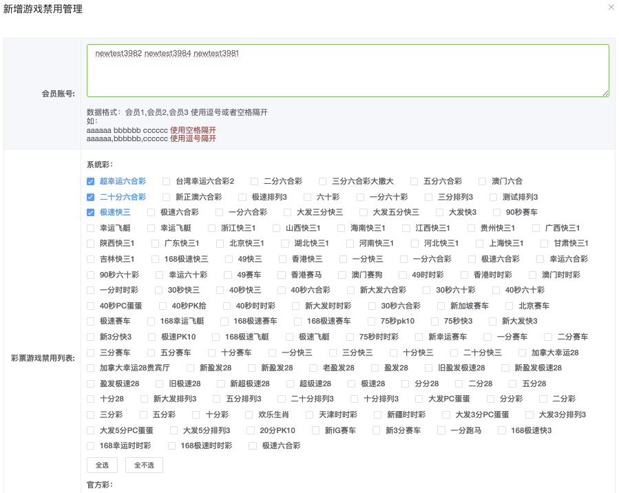 」后弹出「新增游戏禁用管理」,多个会员帐号输入(用逗号、空格分隔),选择禁用游戏。下拉点击「确定」立即新增是列表。