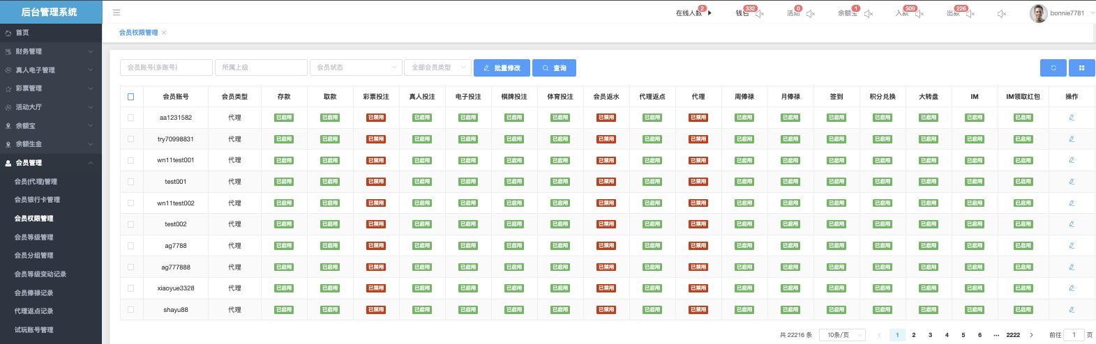 用于查看和管理会员(含代理账号)(支持多帐号)的扩展权限与可用渠道配置。