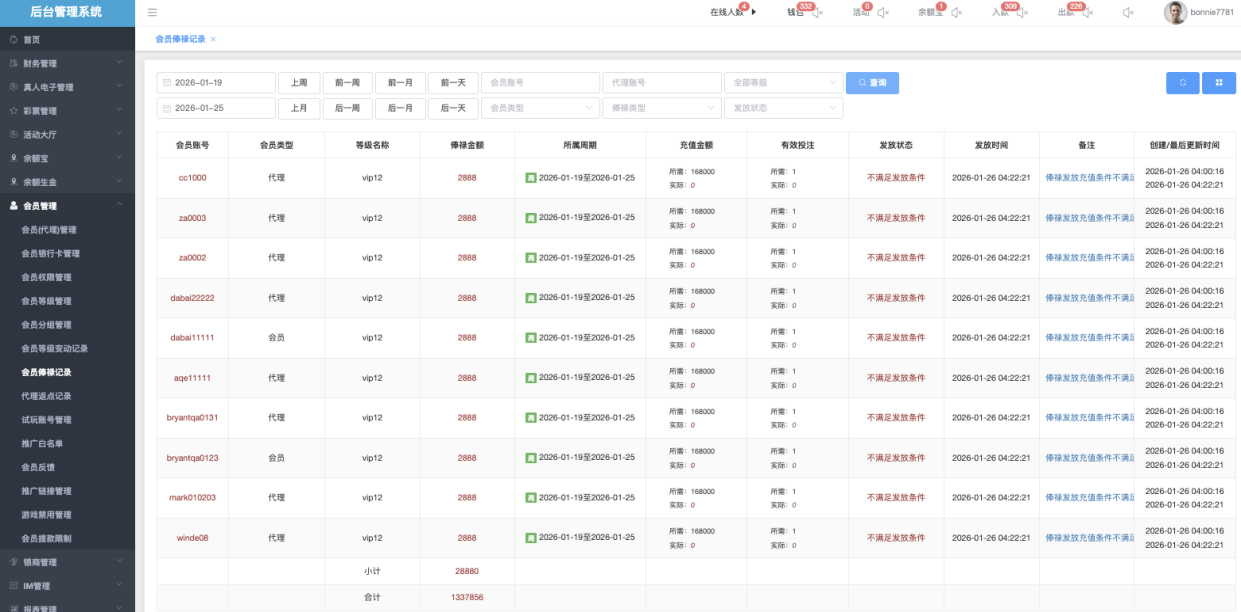 用于查询和查看所有会员周俸禄/月俸禄的发放流水记录,包括每个周期内会员是否满足发放条件、实际发放金额、失败原因等。