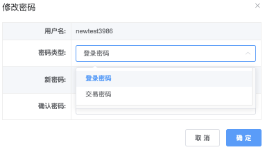 - 密码类型(下拉▼)登陆密码、交易密码,新密码、确认密码。
