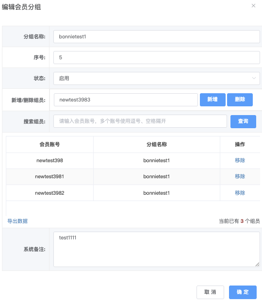 - 会员帐号:输入单个或多个帐号(用逗号或空格分隔),(如 newtest3982 newtest398)