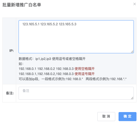 - 点击弹出「批量新增推广白名单」窗口,输入IP→ 点击「确定」后,立即出现在列表内。