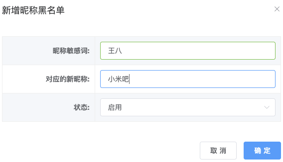 - 昵称敏感词:输入框(必填,示例:导师)
