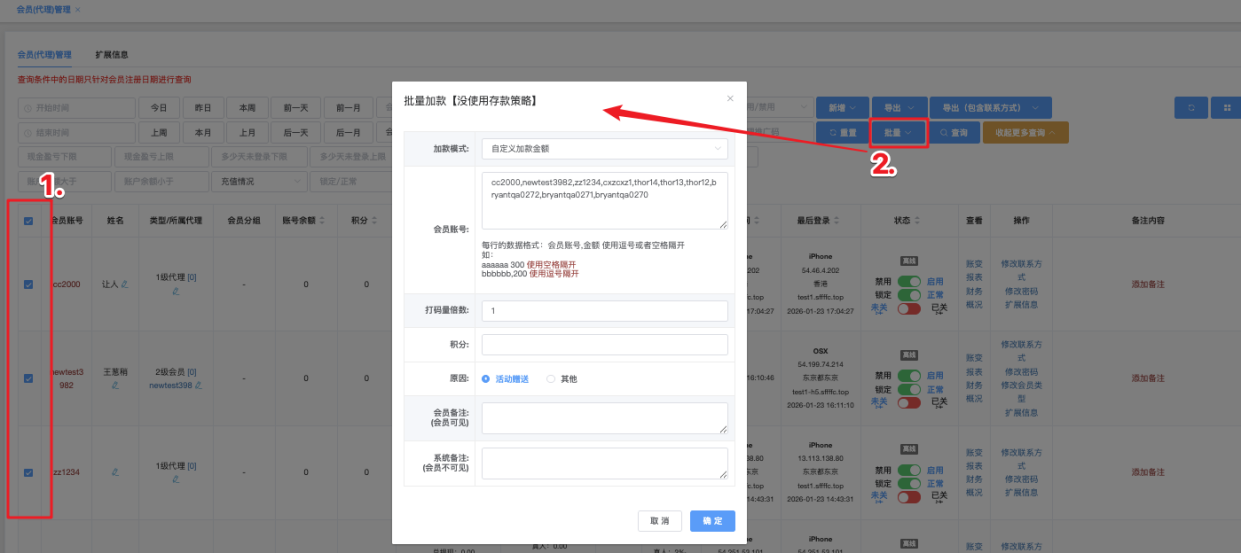 - 点击「批量」按钮,选择要批量操作的项目(如 批量加款),批量选择加款模式不同则填写方式不同。*此处因勾选列表会员帐号,即可不必再手动填写会员帐号。