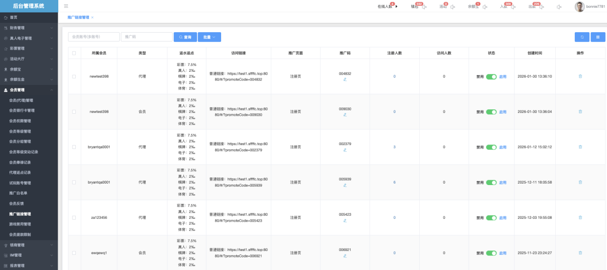 用于查询、维护和统计代理/推广员的专属推广链接(带推广码),这些链接用于引导新用户注册、下注,并为推广员带来返水/返点收益。